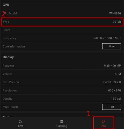 Jika Anda ingin memeriksa apakah perangkat Anda sendiri adalah 32 atau 64-bit, Anda dapat melakukannya dengan mudah dengan AnTuTu benchmark. Setelah Anda download dan diinstal, tekan tombol Info di kanan bawah dan periksa di bawah kategori CPU untuk kolom Jenis. Ini akan memberitahu Anda apa jenis prosesor ponsel Anda.